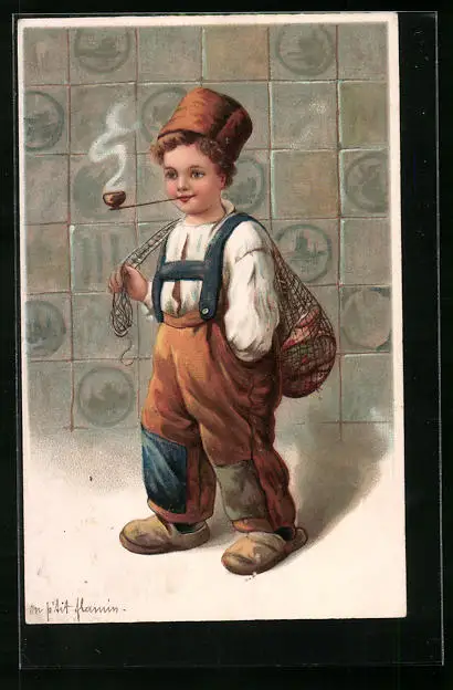 Präge-AK Kleiner niederländischer Fischer mit Pfeife