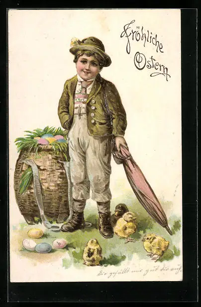 Präge-AK Knabe mit Osterküken und Schirm
