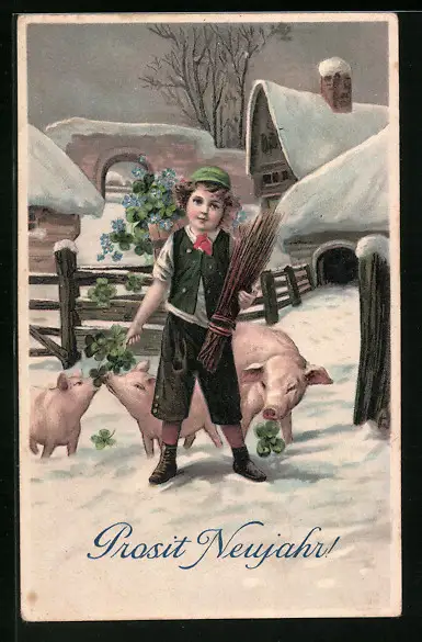Präge-AK Knabe mit Reisigbündel und Schweinen, Neujahrsgruss
