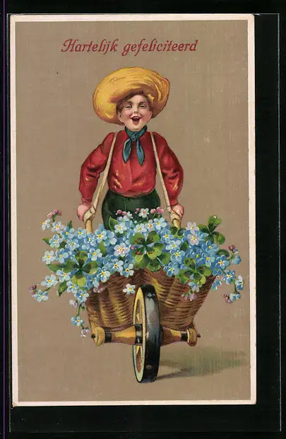 Präge-AK Knabe mit Schubkarre voller Blumen