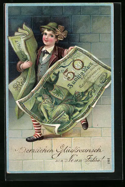 Präge-AK Knabe mit riesigen Geldscheinen zum neuen Jahr