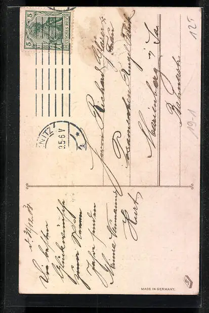 Personenbezogene Daten auf der Rückseite der Karte wurden durch blauen Textmarker unkenntlich gemacht. Die blauen Stellen sind auf die Vorderseite durchgeweicht und wirken sich negativ auf das Postkartenfoto aus