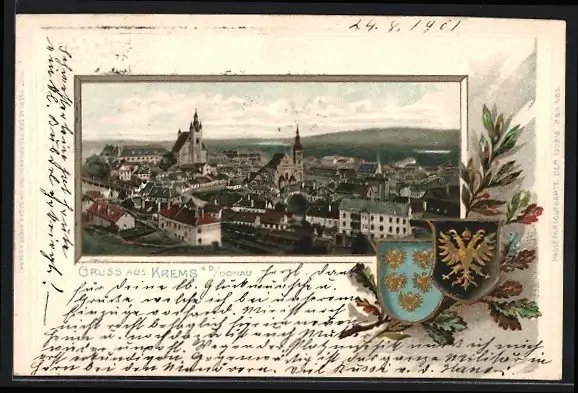 Präge-AK Krems a. d. Donau, Teilansicht, Wappen, Passepartout
