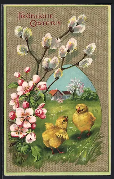 Präge-AK Landschaft mit Osterküken, Kätzchenzweige, Ostergruss
