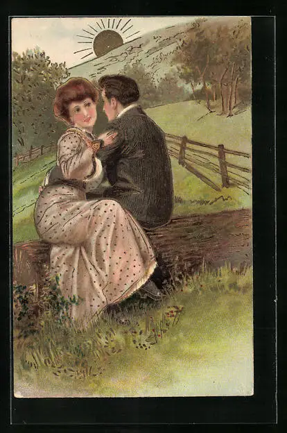 Präge-AK Liebespaar sitzt auf einem Baumstamm