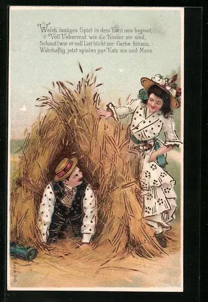 Präge-AK Liebespaar spielt Verstecken zwischen Korngarben