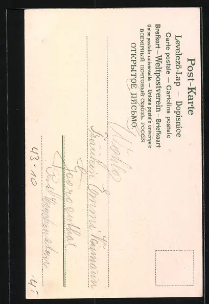Personenbezogene Daten auf der Rückseite der Karte wurden durch blauen Textmarker unkenntlich gemacht. Die blauen Stellen sind auf die Vorderseite durchgeweicht und wirken sich negativ auf das Postkartenfoto aus