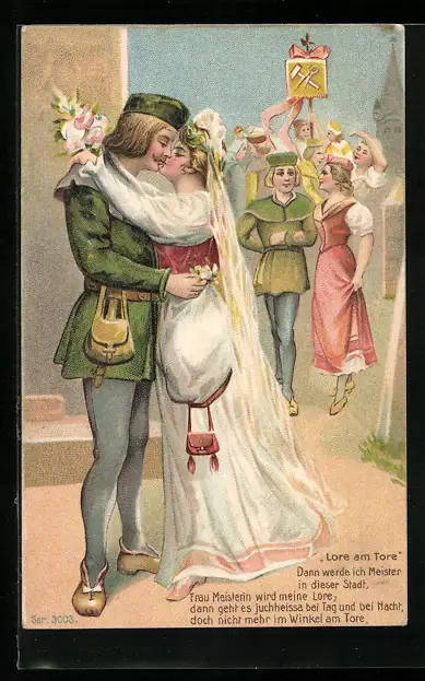 Präge-AK Lore am Tore, Liebespaar beim Kuss