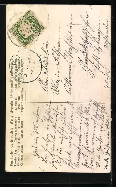 Personenbezogene Daten auf der Rückseite der Karte wurden durch blauen Textmarker unkenntlich gemacht. Die blauen Stellen sind auf die Vorderseite durchgeweicht und wirken sich negativ auf das Postkartenfoto aus