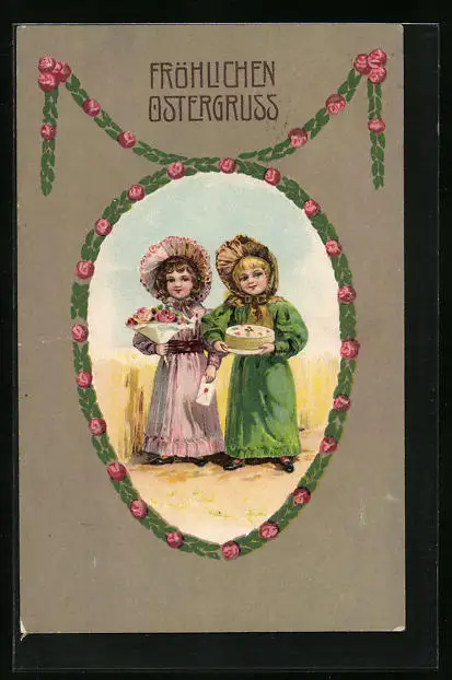 Präge-AK Mädchen in Kleidern zum Osterfest