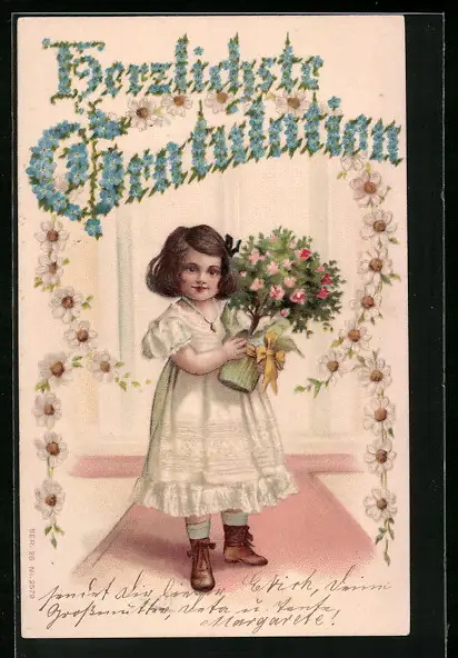 Präge-AK Mädchen mit Blumen im Topf
