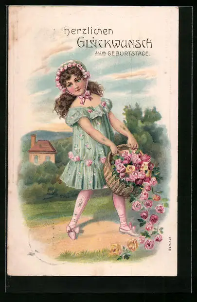 Präge-AK Mädchen mit Korb voll Rosen, Geburtstag