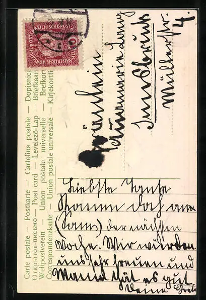 Personenbezogene Daten auf der Rückseite der Karte wurden durch blauen Textmarker unkenntlich gemacht. Die blauen Stellen sind auf die Vorderseite durchgeweicht und wirken sich negativ auf das Postkartenfoto aus
