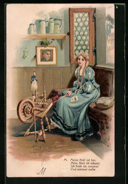 Präge-AK Mädchen mit schwerem Herzen am Spinnrad