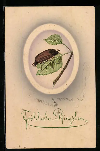 Präge-AK Maikäfer auf Birkenblatt, Pfingstgruss