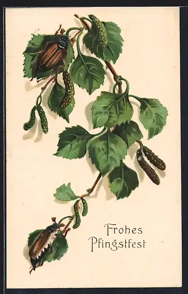 Präge-AK Maikäfer auf einem Birkenzweig, Pfingstgruss