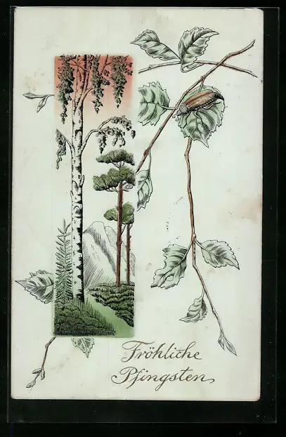 Präge-AK Maikäfer auf einem Blatt, Berglandschaft, Pfingstgruss