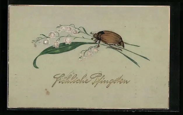 Präge-AK Maikäfer auf einem Maiglöckchenstiel, Pfingstgruss
