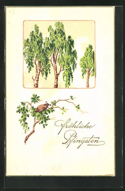 Präge-AK Maikäfer krabbelt auf einem Blätterzweig, Fröhliche Pfingsten