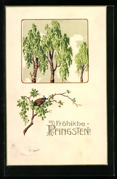 Präge-AK Maikäfer krabbelt auf einem Blätterzweig, Fröhliche Pfingsten