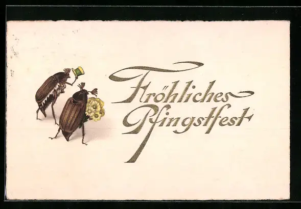 Präge-AK Maikäferpaar mit Zylinder und Blumenstrauss, Pfingstgruss