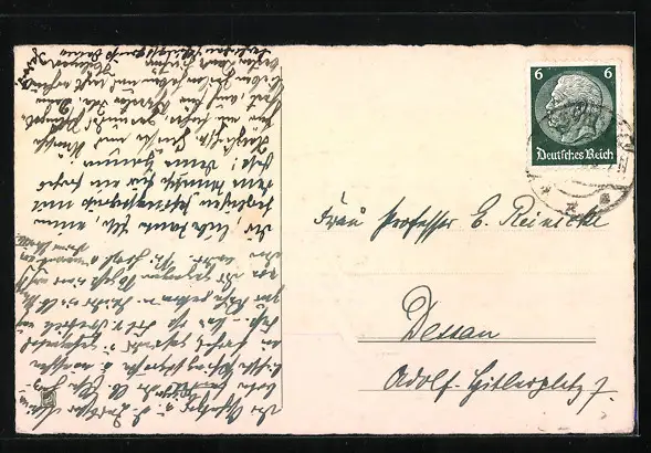 Personenbezogene Daten auf der Rückseite der Karte wurden durch blauen Textmarker unkenntlich gemacht. Die blauen Stellen sind auf die Vorderseite durchgeweicht und wirken sich negativ auf das Postkartenfoto aus