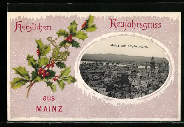 Präge-AK Mainz, Teilansicht vom Stephansturm aus, Neujahrsgruss