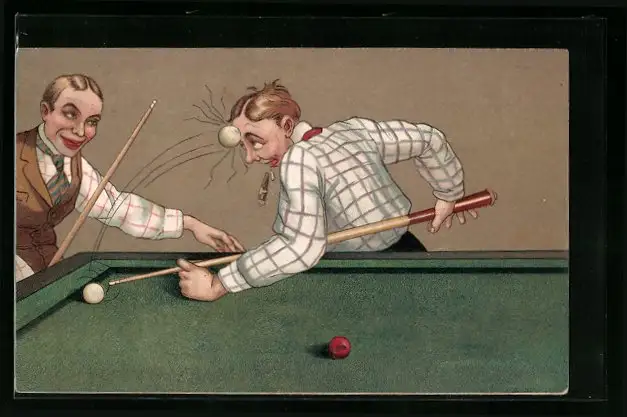 Präge-AK Mann bekommt beim Billard Kugel gegen den Kopf
