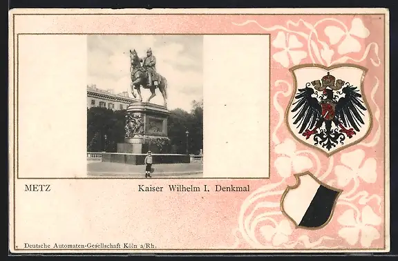 Präge-AK Metz, Kaiser Wilhelm I.-Denkmal, Wappen, Passepartout