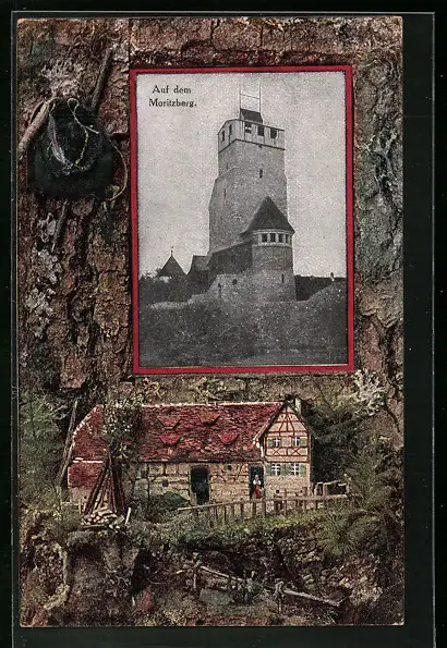 Präge-AK Moritzberg, Burgturm, Passepartout
