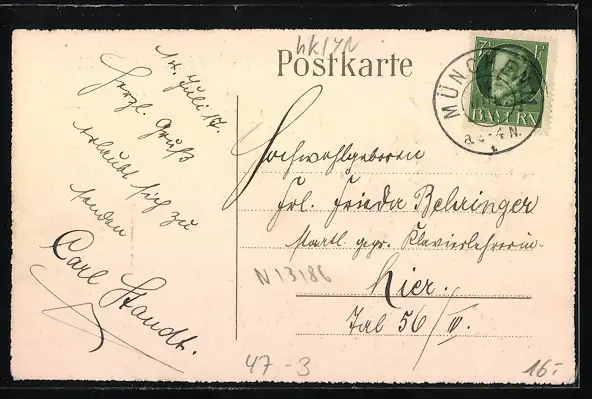 Personenbezogene Daten auf der Rückseite der Karte wurden durch blauen Textmarker unkenntlich gemacht. Die blauen Stellen sind auf die Vorderseite durchgeweicht und wirken sich negativ auf das Postkartenfoto aus