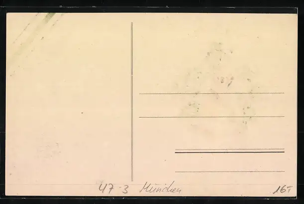 Personenbezogene Daten auf der Rückseite der Karte wurden durch blauen Textmarker unkenntlich gemacht. Die blauen Stellen sind auf die Vorderseite durchgeweicht und wirken sich negativ auf das Postkartenfoto aus