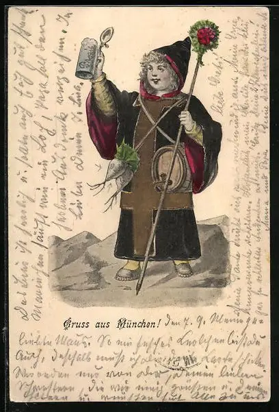Präge-AK Münchner Kindl hebt grüssend seinen Bierkrug