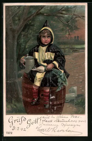 Präge-AK Münchner Kindl mit Bierkrug sitzt auf einem Fass