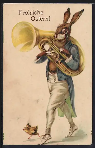 Präge-AK Musizierender Hase im Anzug mit Osterküken, Ostergruss