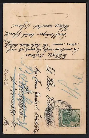 Personenbezogene Daten auf der Rückseite der Karte wurden durch blauen Textmarker unkenntlich gemacht. Die blauen Stellen sind auf die Vorderseite durchgeweicht und wirken sich negativ auf das Postkartenfoto aus