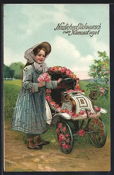 Präge-AK Namenstag, Mädchen mit Blumen-Auto