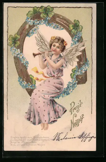 Präge-AK Neujahrsengel mit Flöte auf Vergissmeinnichtkranz