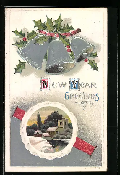 Präge-AK Neujahrsgrüsse, verschneiter Ort und silberne Glocken