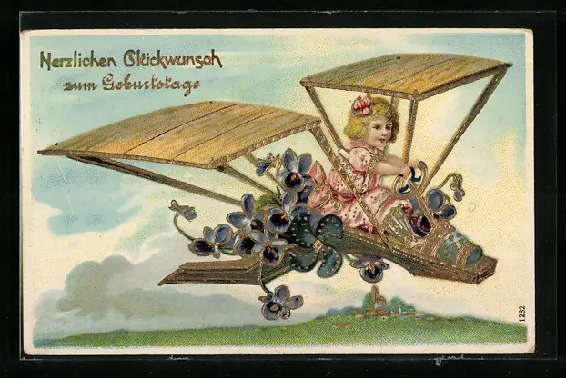 Präge-AK Neujahrsgruss, Mädchen mit Veilchen im Flugzeug