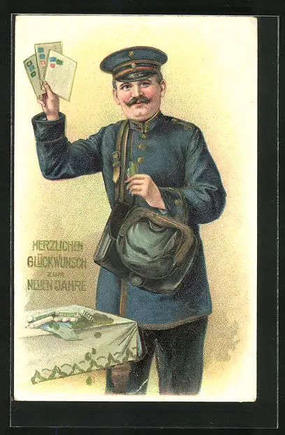 Präge-AK Neujahrsgruss, Postbote, Ansichtskartengeschichte