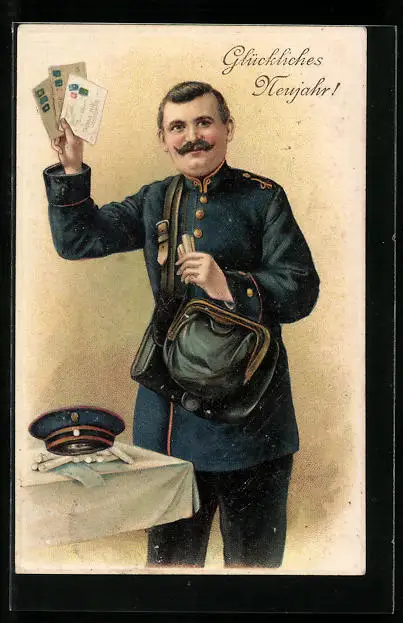 Präge-AK Neujahrsgruss, Postbote mit Briefen