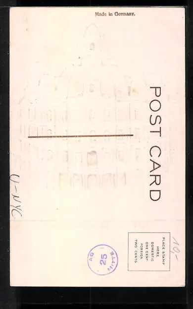 Personenbezogene Daten auf der Rückseite der Karte wurden durch blauen Textmarker unkenntlich gemacht. Die blauen Stellen sind auf die Vorderseite durchgeweicht und wirken sich negativ auf das Postkartenfoto aus