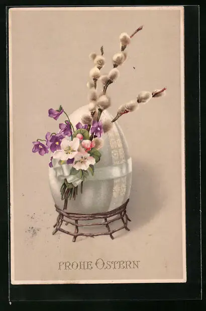 Präge-AK Osterei mit Blumen und Palmkätzchen