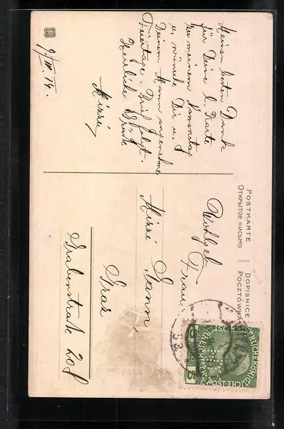 Personenbezogene Daten auf der Rückseite der Karte wurden durch blauen Textmarker unkenntlich gemacht. Die blauen Stellen sind auf die Vorderseite durchgeweicht und wirken sich negativ auf das Postkartenfoto aus