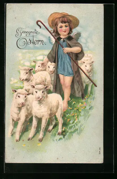 Präge-AK Osterengel mit Lämmern