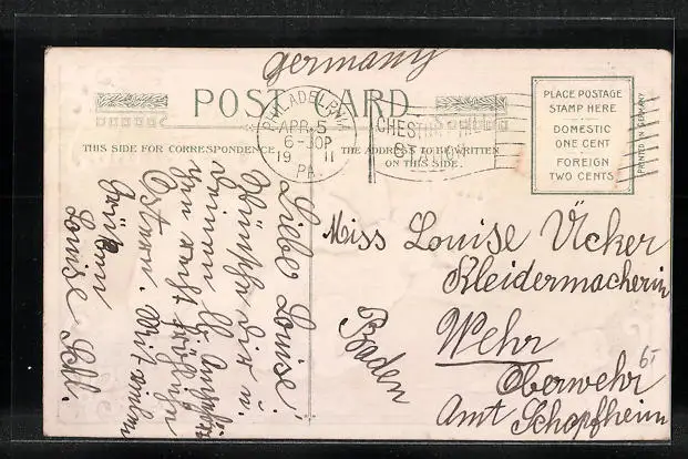 alte Ansichtskarte, gelaufen, Briefmarke entfernt, guter Zustand