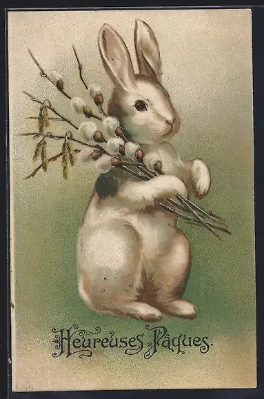 Präge-AK Osterhase mit Weidenzweigen, Heureuses Pâques