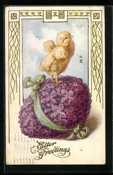 Präge-AK Osterküken auf Ei mit Veilchen-Dekor