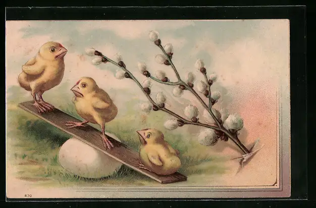 Präge-AK Osterküken auf der Wippe mit Palmkätzchenzweigen